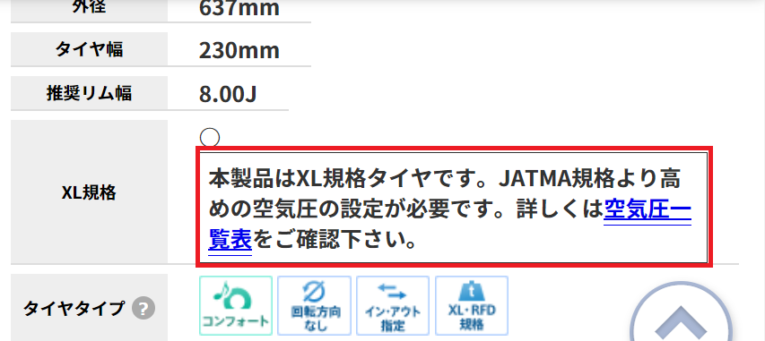 AUTOWAY(輸入タイヤの通販サイト)なんかだと、該当のタイヤにはこんなデカデカと説明書きがされている。空気圧調整時忘れないで。